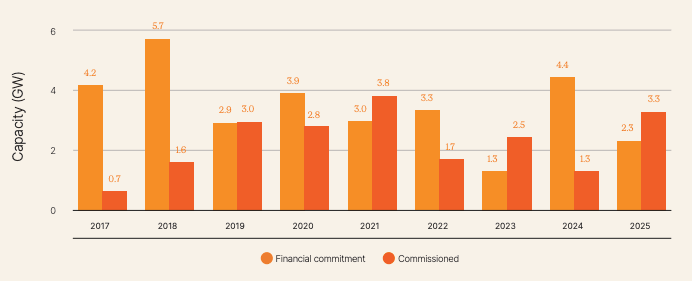 Still, not only is investment committed for new generation down sharply on an annual basis, but the capacity brought into the construction phase by those financial commitments in calendar 2025 was the second lowest on record at just 2.3GW.