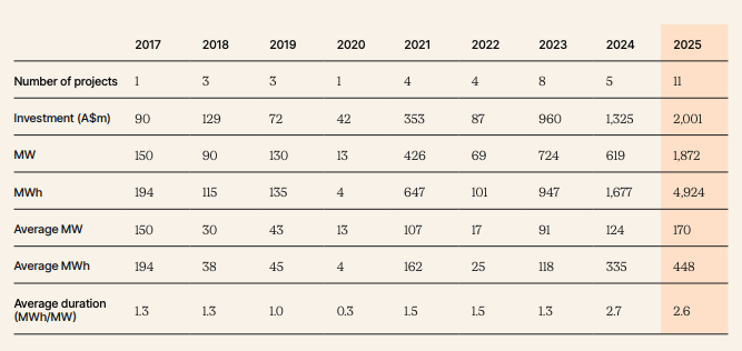 Overall in calendar 2025, 11 storage projects with 1.9GW/4.9GWh of capacity achieved final commissioning. The 4.9GWh of energy storage exceeded that commissioned in the previous eight years combined.