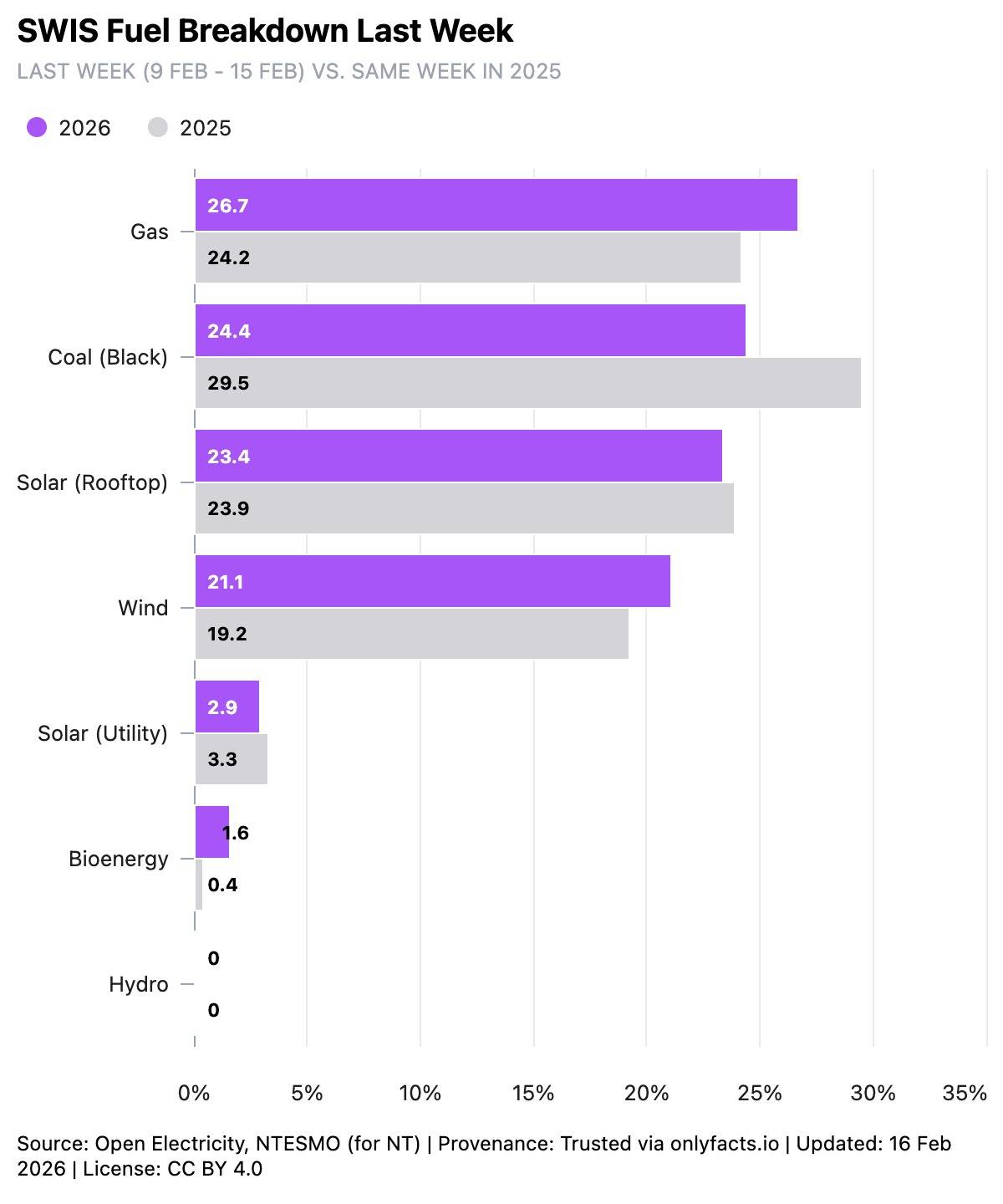 SWIS Renewables Breakdown Last week (9 Feb - 15 Feb) vs. same week in 2025: