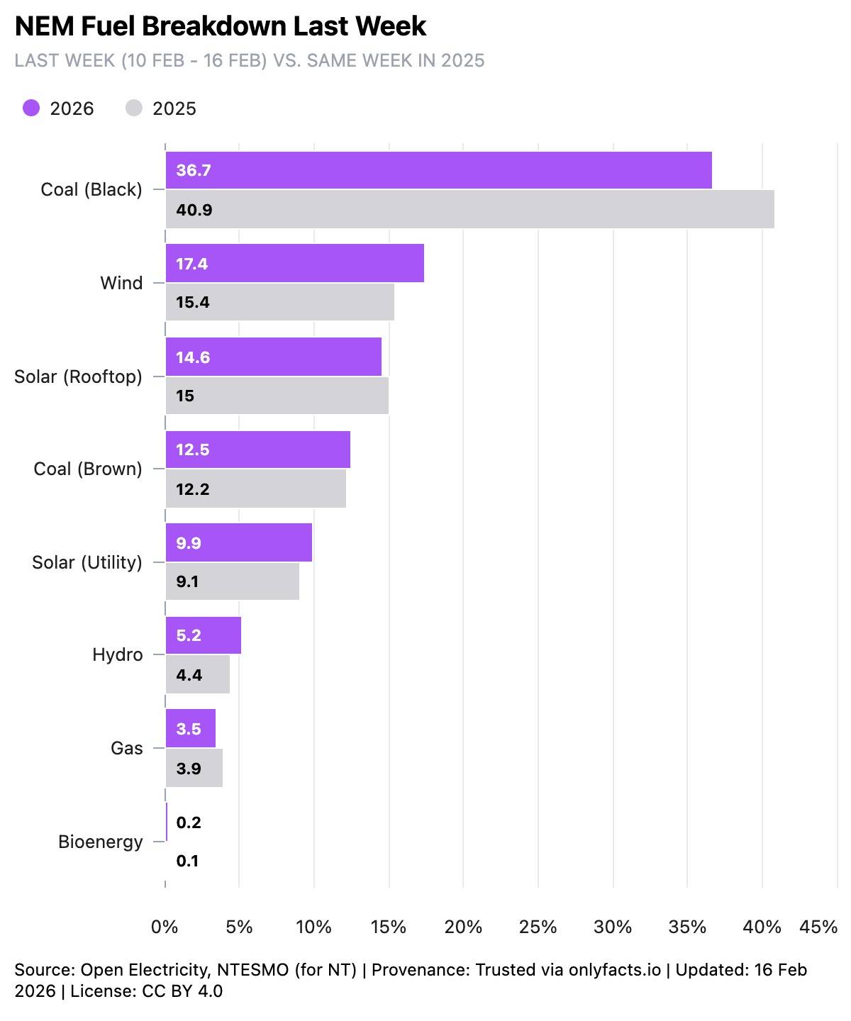 NEM Renewables Breakdown Last week (10 Feb - 16 Feb) vs. same week in 2025: