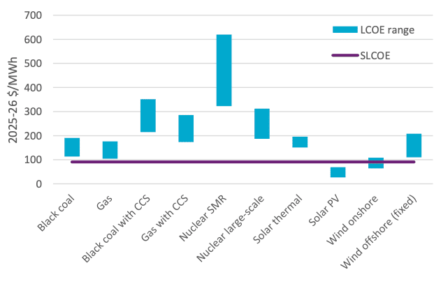 Black coal plant costs have increased at a steady clip to about $7000 per kilowatt capacity by 2025; add CCS and the capital cost goes nuclear ($13,000/KW). Gas (combined cycle or open cycle) are cheap to build (around $2000/KW) but costly to fuel, and very costly with CCS (around $7000/KW).