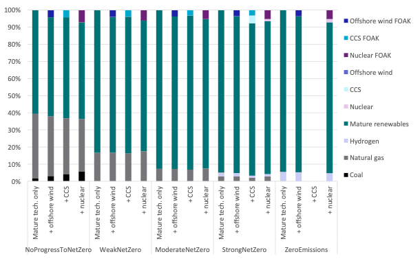 In that scenario, CCS and nuclear only get a look-in if mandated, gas (and hydrogen) play a very small role and the grid is dominated by “mature renewables”, or wind and solar, backed by storage.