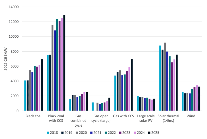 The futility of wishing coal generation back into the grid mix is starkly illustrated by this chart, which shows the capital cost component of generation over the eight years since CSIRO began compiling GenCost.