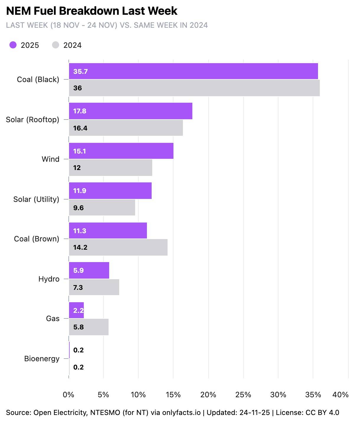 NEM Renewables Breakdown Last week (18 Nov - 24 Nov) vs. same week in 2024:
