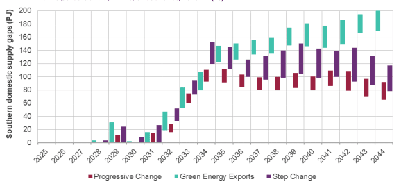 The upshot is that if significant new supplies are not brought online, supply gaps emerge in southern regions in 2028, and get worse in the 2030s. By 2035 the gap is forecast to be between 100 PJ/year and 140 PJ/year, depending on the scenario.