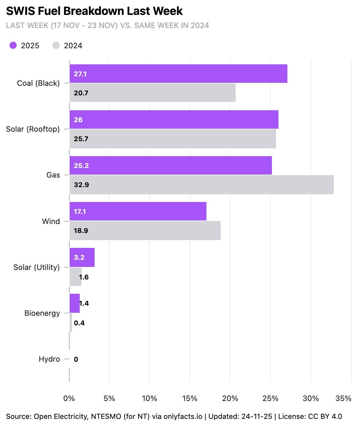 SWIS Renewables Breakdown Last week (17 Nov - 23 Nov) vs. same week in 2024: